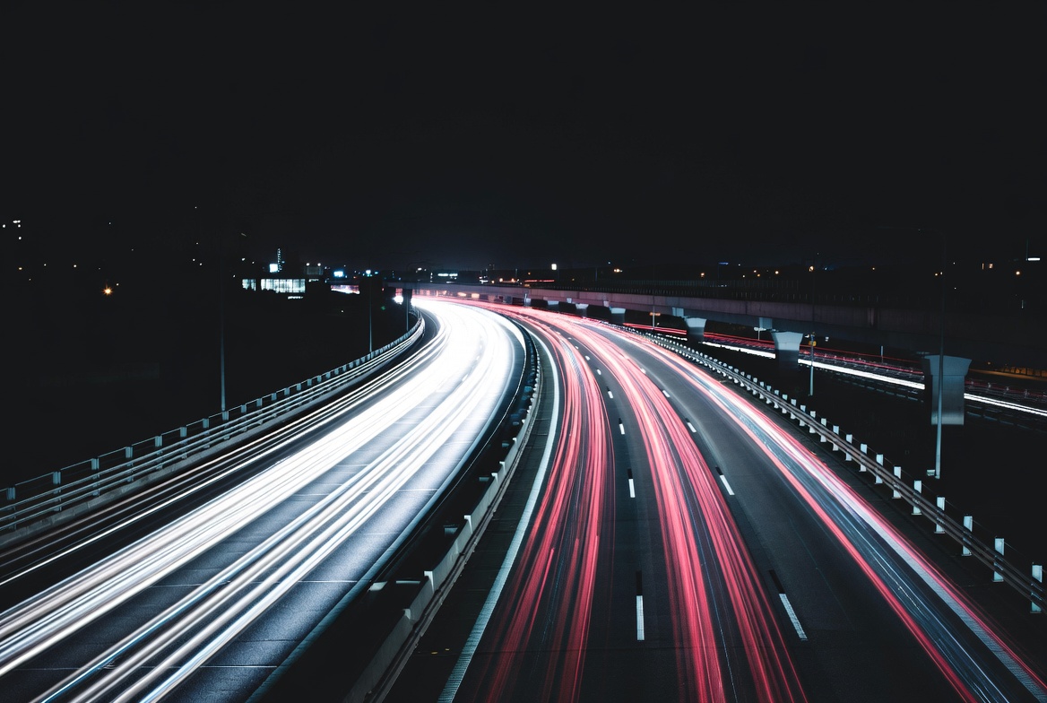 cars, curve, dark, driving, elevated road, expressway, freeway, guardrails, light trails, long exposure, motion blur, night, nighttime drive, red lights, road, speed, streetlights, traffic, transportation, urban, vehicle lights, white lights, highway