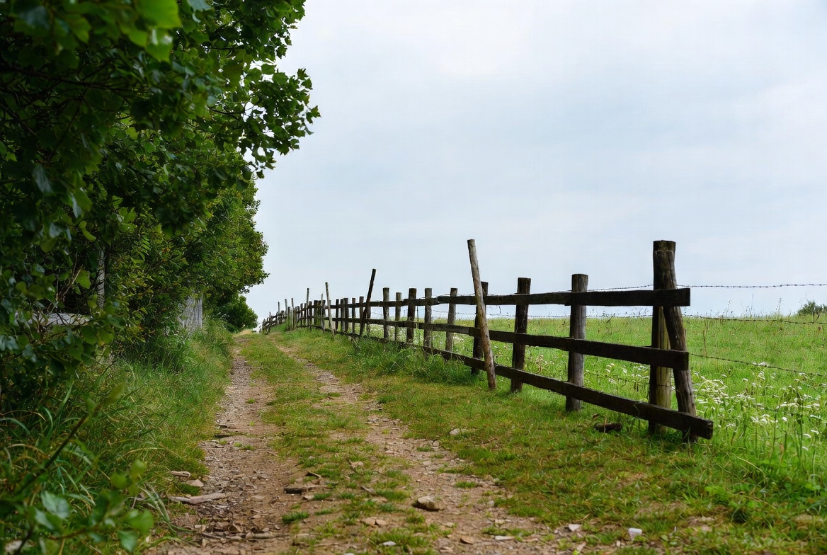 barbed wire, cloudy sky, countryside, dirt path, fence, field, grass, grassy path, green meadow, green trees, landscape, nature, outdoors, path trail, rural landscape, rustic fence, scenery, wildflowers, wooden posts, wooden fence