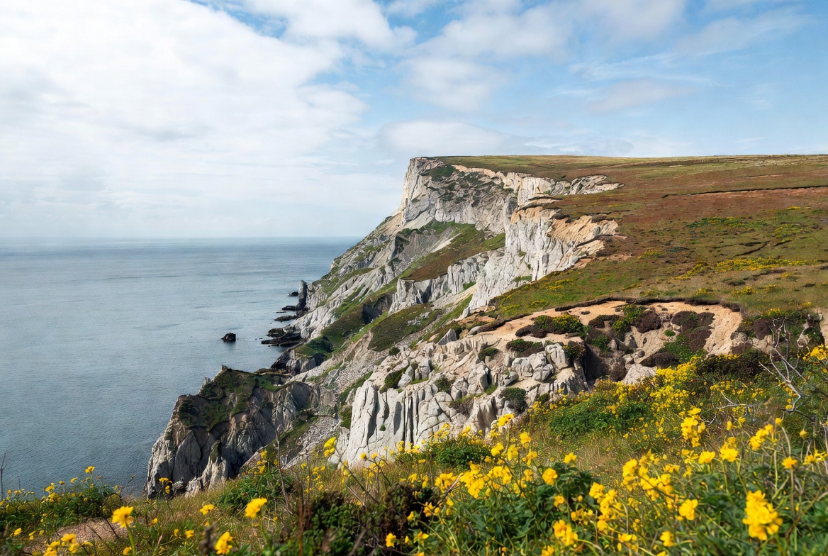 blue sky, clouds, coastal scenery, coastline, dramatic cliffs, floral cliffs, grass, green grass, landscape, nature, ocean, outdoors, rocks, sea, seaside, sky, waves, white cliffs, yellow flowers, cliffs