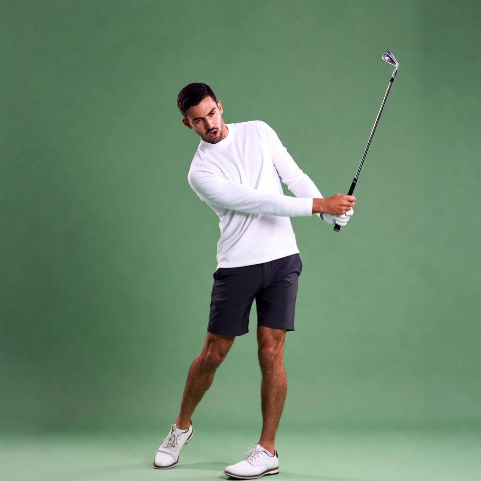 A man with short dark hair and a beard stands on a green background, mid-swing with a golf club. He wears a white long-sleeve shirt, black shorts, white sneakers, and a white glove on his right hand. His body is twisted in a dynamic golf swing pose.
