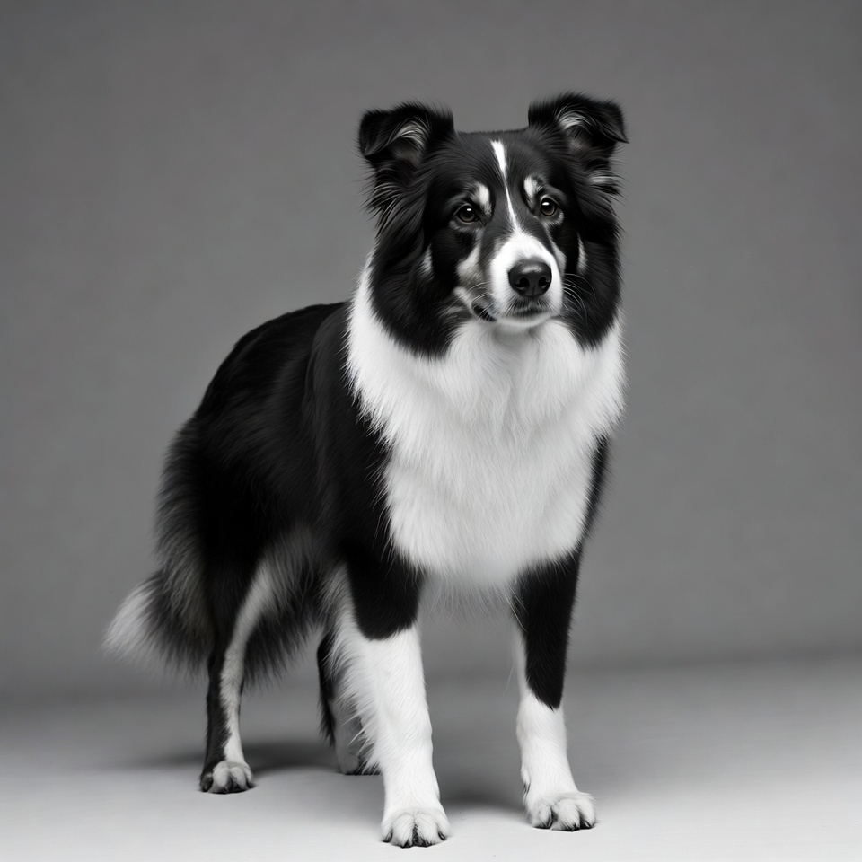 A fluffy black and white Border Collie stands on a plain gray background. The dog has perky ears, bright eyes, and a bushy tail. Its fur features distinct white markings on the face, chest, paws, and tail tip.