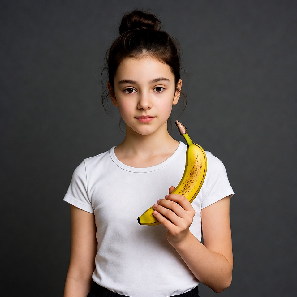 A young girl with dark hair in a bun stands against a gray background, holding a ripe yellow banana in her right hand. She wears a white short-sleeved t-shirt and black pants, looking directly at the camera with a neutral expression. The banana is positioned near her face.