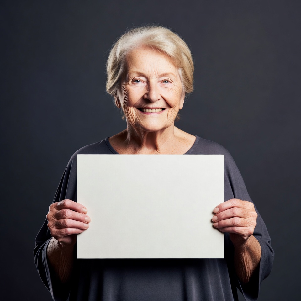 White, blank sign, dark background, female, gray hair, gray top, hands holding, happy, holding sign, isolated background, joyful expression, old woman, portrait, senior woman, short hair, smiling, studio photo, white sign, woman, elderly woman