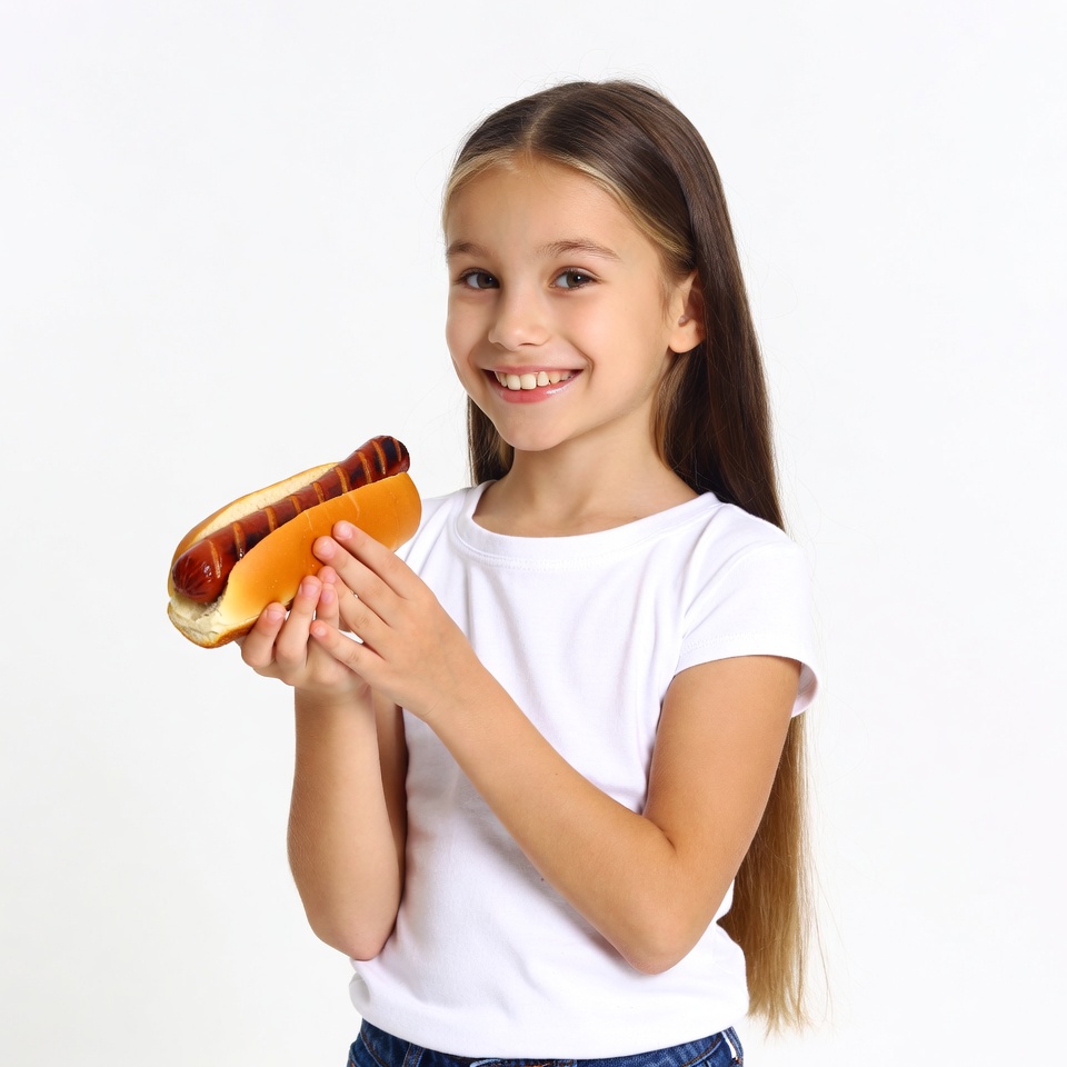 A young girl with long brown hair smiles while holding a large hot dog with both hands. She wears a white t-shirt and blue jeans against a white background. The hot dog has a browned sausage topped with a bun.
