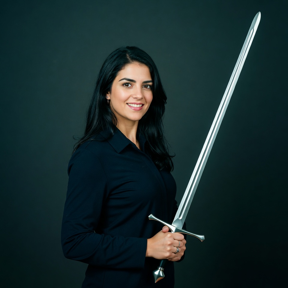 Middle Eastern, collared shirt, dark background, dark blue shirt, female, holding sword, large sword, long black hair, longsword, portrait, shiny sword, smiling, standing pose, sword grip, woman