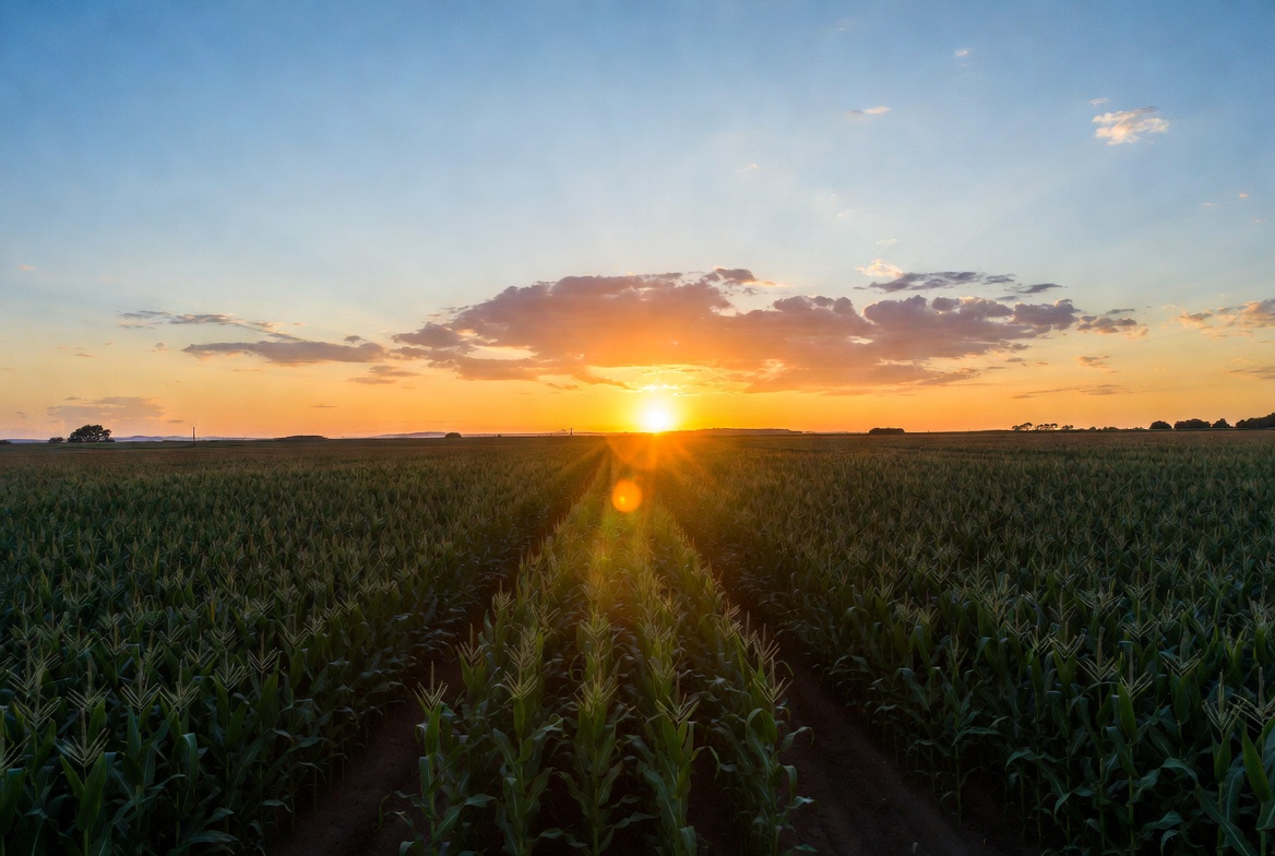 agriculture, blue sky, clouds, corn, cornfield, crops, evening, farming, farmland, field, golden hour, green corn, harvest, landscape, maize, nature, orange sky, outdoors, path, rows, rural, scenic, sky, sun rays, sunset