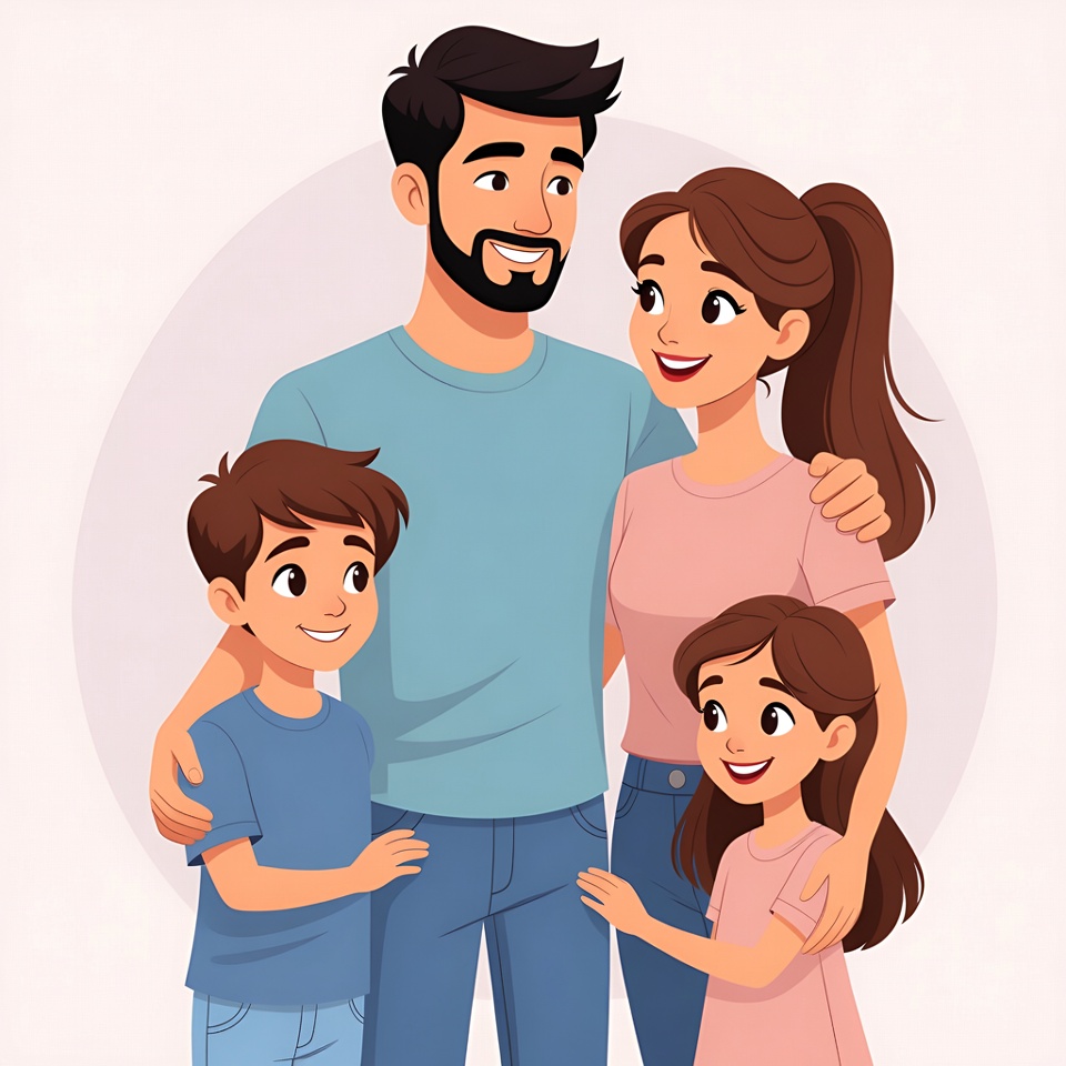 A cartoon illustration shows a smiling man with a beard and blue t-shirt embracing his wife in a pink t-shirt and their two young children. The boy wears a blue t-shirt and the girl a pink one, all standing close with arms around each other. They are posed against a simple white background with a subtle circular glow.
