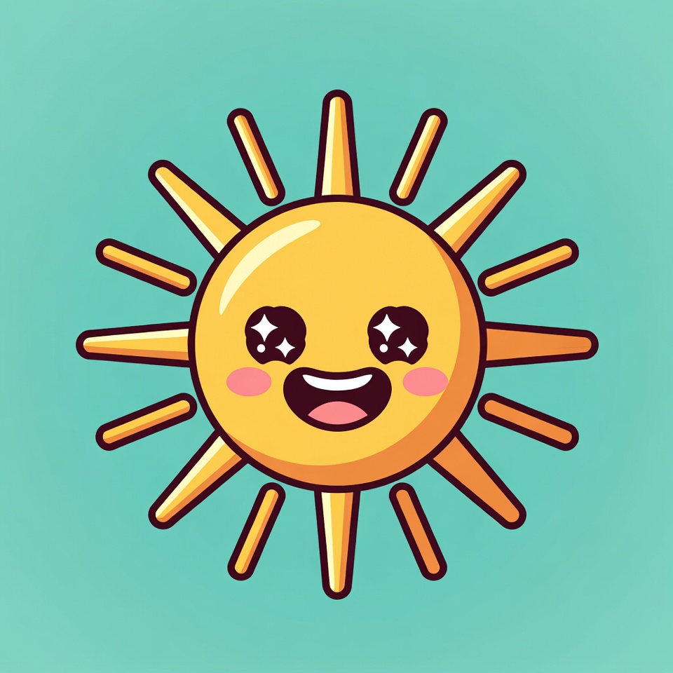 A vibrant yellow sun with a happy face and sparkling eyes smiles widely on a light turquoise background. It features bold black outlines, rosy cheeks, and radiating rays in a kawaii cartoon style. The illustration is simple and isolated against the solid background.