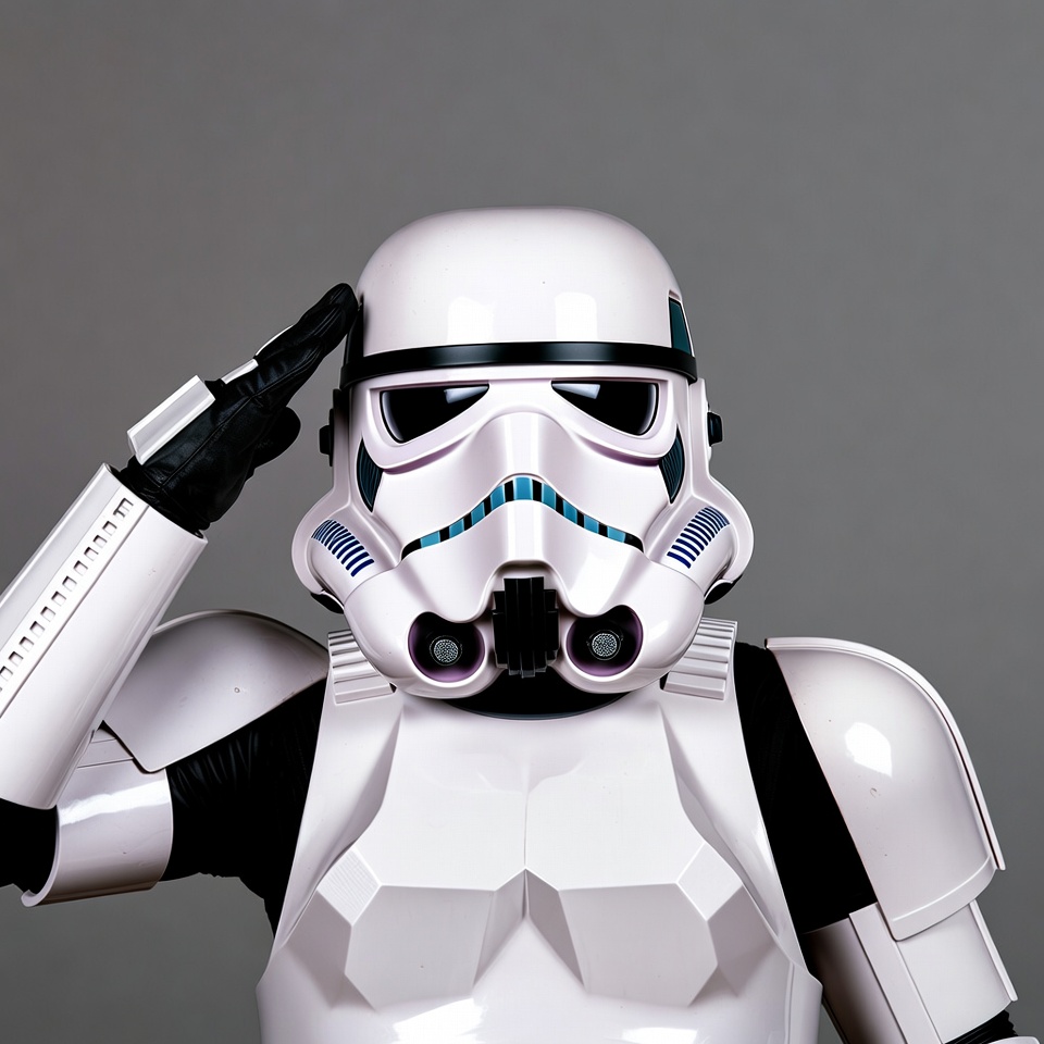 Imperial trooper, Star Wars, black gloves, clone trooper, futuristic armor, gray background, helmet, isolated background, military salute, salute, saluting, sci-fi soldier, space soldier, white armor, Stormtrooper