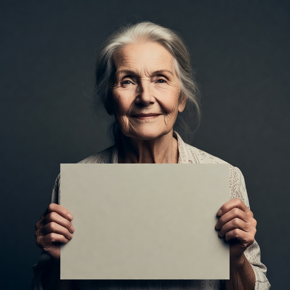 An elderly White woman with silver hair smiles gently while holding a large blank white sign in front of her. She wears a light-colored lace blouse and stands against a dark gray background. Her hands grip the sign firmly at chest level.