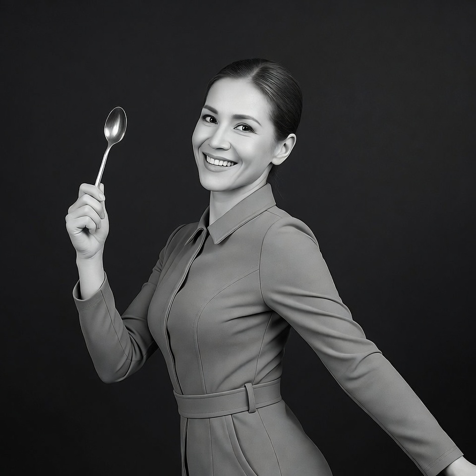 A smiling Asian woman with hair in a bun holds a spoon in her right hand against a black background. She wears a collared gray dress with a belt and extends her left arm outward. The image is in black and white.