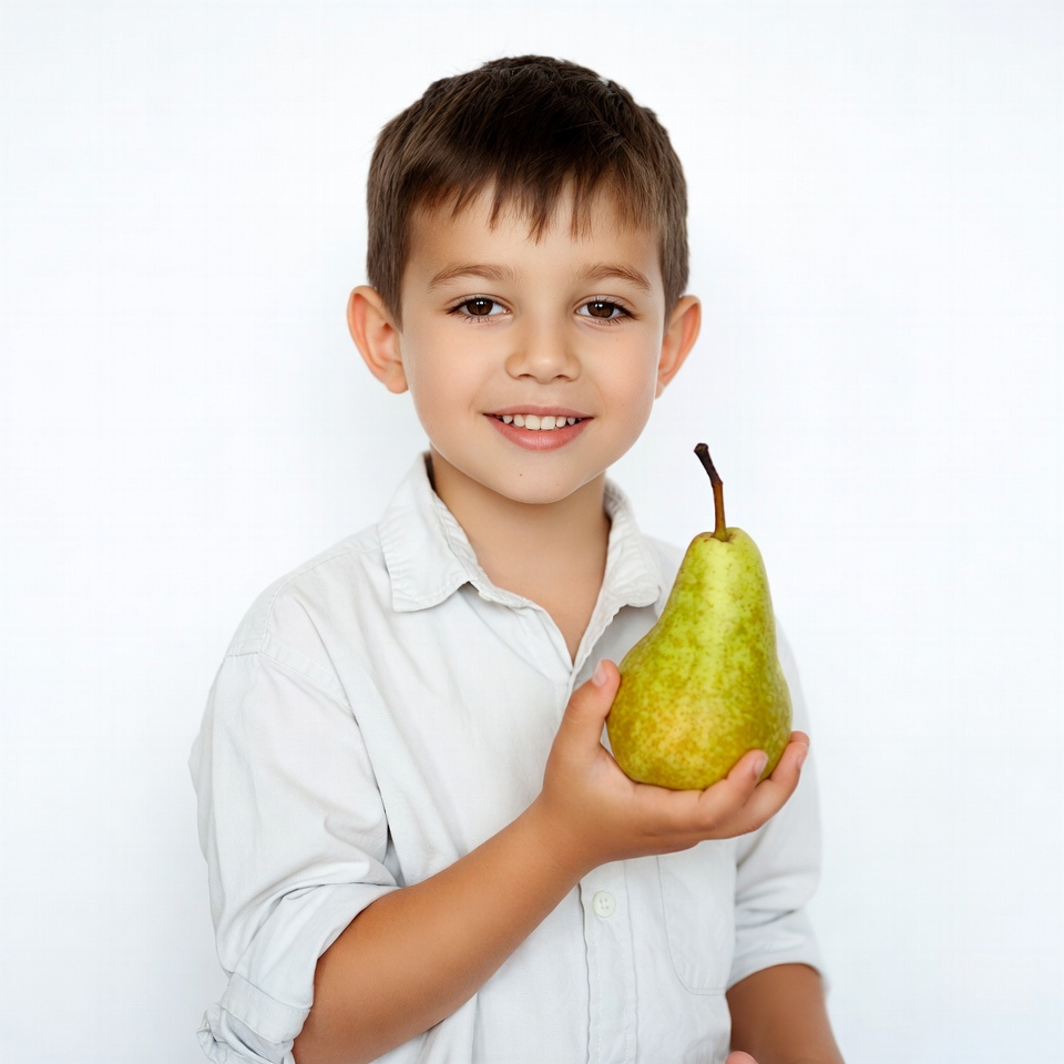 A young boy with short brown hair smiles at the camera while holding a large green pear in his hand. He wears a light blue collared shirt and stands against a plain white background. The pear is ripe with a visible stem.