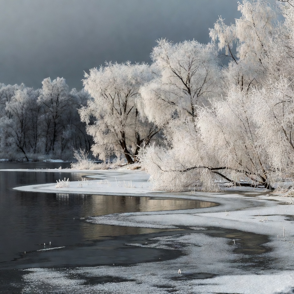 Frost-covered trees with white branches line the edge of a frozen lake under a cloudy sky. Snow dusts the ground and ice surface, creating reflective patterns on the water. The scene features a serene winter landscape with curved shoreline.