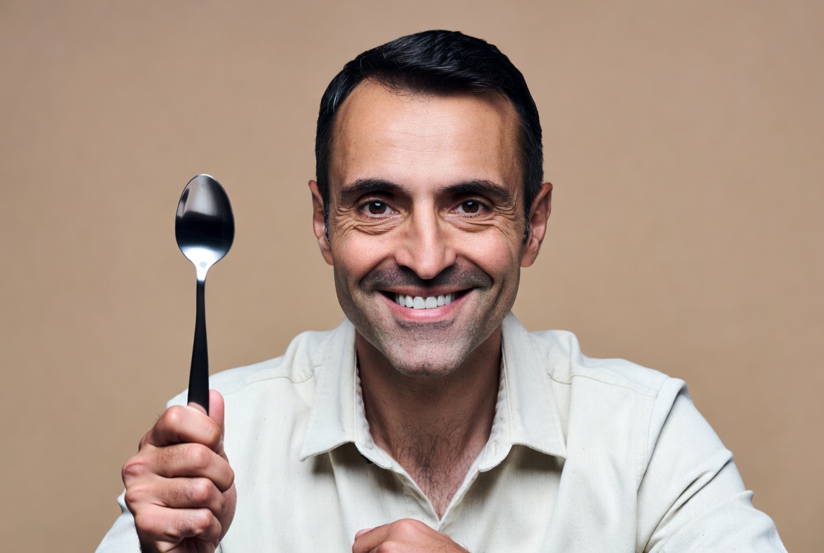 A smiling Middle Eastern man with short dark hair holds up a shiny silver spoon in his right hand. He wears a light-colored collared shirt and stands against a beige background. His expression is cheerful with a wide smile.