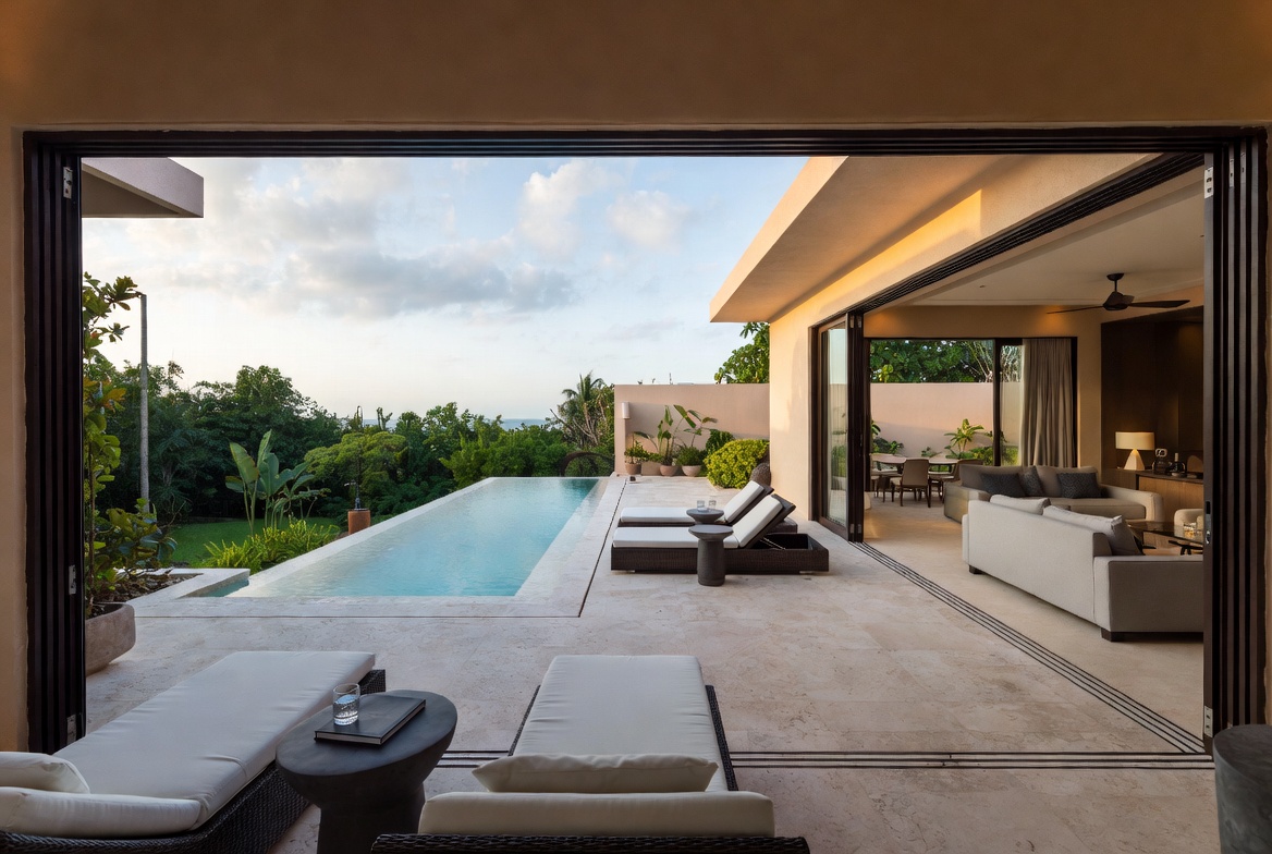 architecture, beach house, beige sofa, dusk sky, infinity pool, interior design, lounge chairs, low tables, lush greenery, modern furniture, ocean horizon, open plan, outdoor living, palm trees, poolside, resort villa, sliding doors, sunset view, swimming pool, terrace, tropical garden, vacation home, white cushions, luxury villa