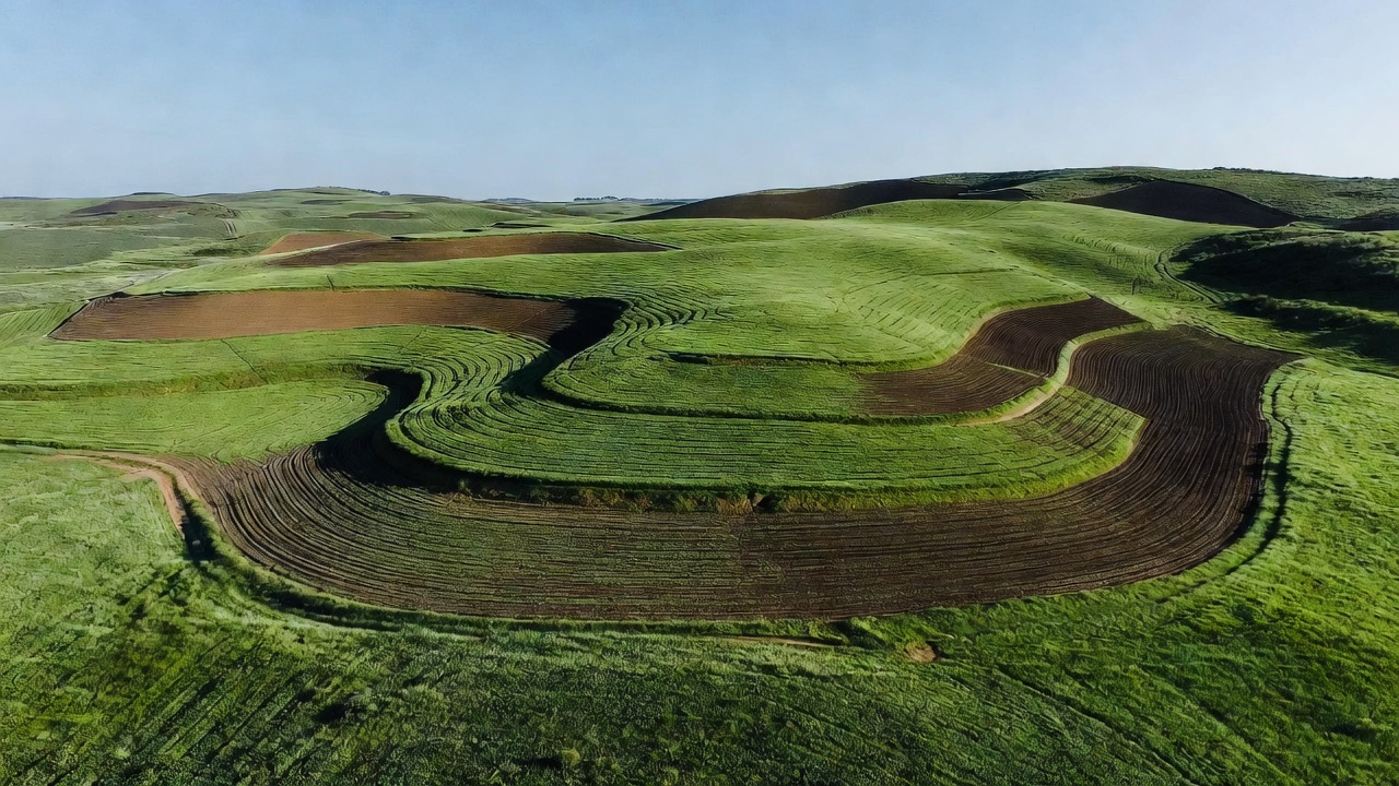 agricultural land, agriculture, brown soil, countryside, curved fields, drone photo, earth, farm fields, farmland, field patterns, fields, grass, green fields, green grass, hill farming, hills, landscape, patterns, plowed soil, rolling hills, rural, soil, spiral design, terraces, terrain, wavy fields, aerial view