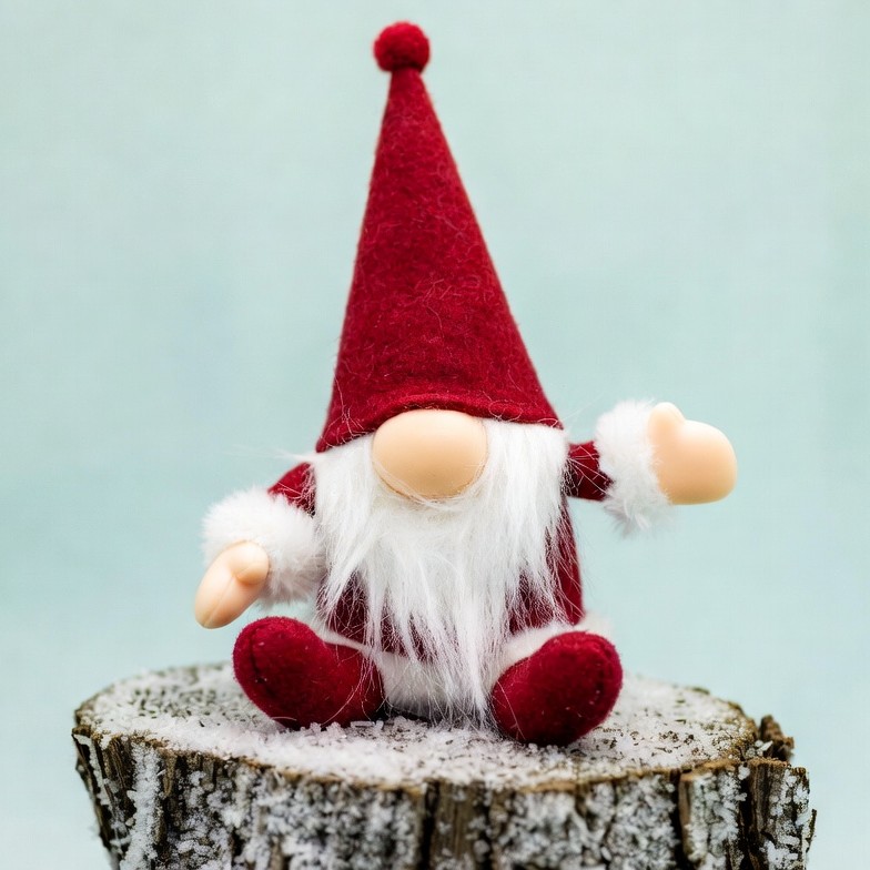 Christmas decoration, Christmas gnome, Scandinavian gnome, cute gnome, felt gnome, holiday gnome, illustration, isolated background, light blue background, nisse, pointing hand, red hat, red pants, sitting gnome, snow, snowy stump, tomte, tree stump, waving hand, white beard, white fur trim, winter gnome, gnome