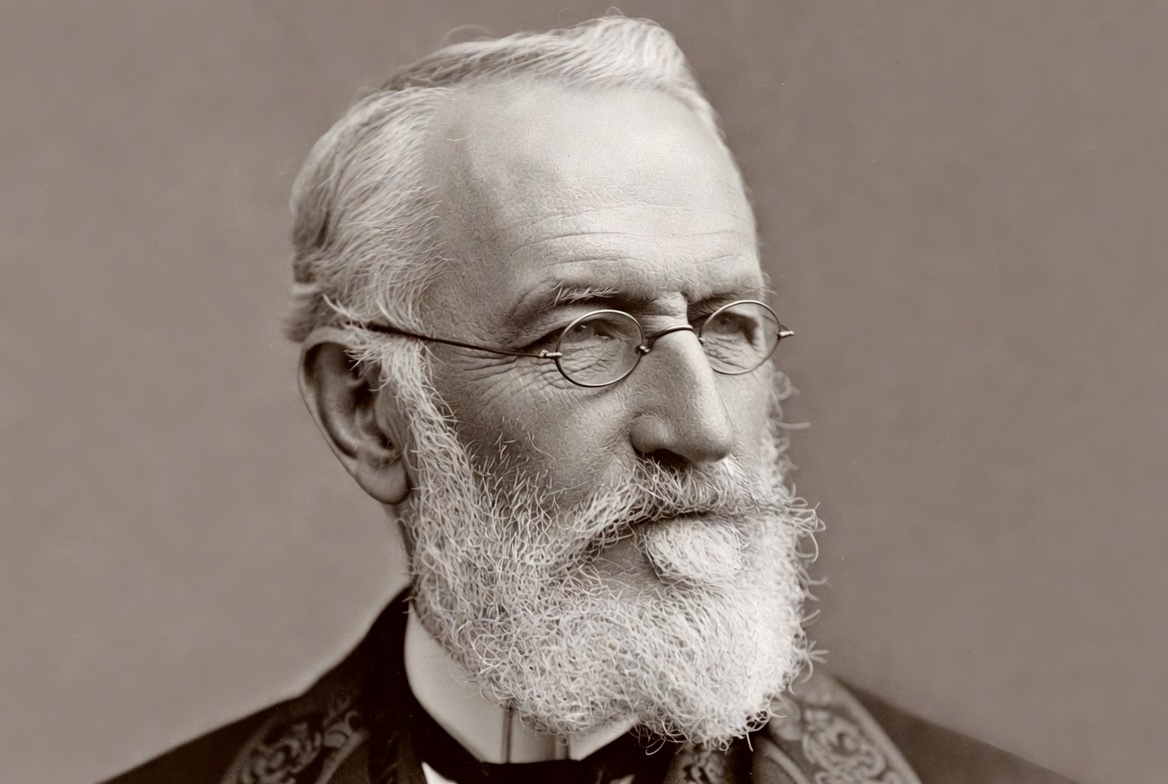 A sepia-toned portrait of an elderly White man with a full white beard and mustache. He wears round wire-rimmed glasses and a formal suit with ornate lapels. His hair is neatly combed back, and he gazes slightly to the side against a plain background.