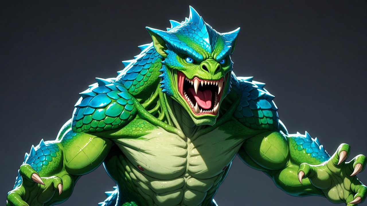 A muscular green lizard-like monster with scales and sharp claws roars aggressively. It has a fierce expression with bared fangs and glowing eyes on a dark isolated background. The creature's body is detailed with teal accents and powerful build.