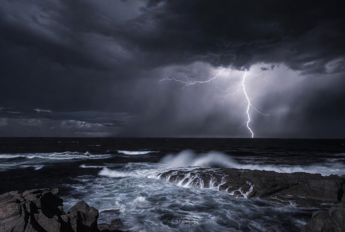 bolt, cliffs, clouds, crashing waves, dark sky, dramatic sky, heavy clouds, night, ocean, rain, rocks, rugged rocks, sea, storm, stormy sea, thunder, thunderbolt, waves, weather, lightning