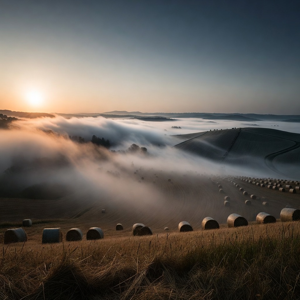 Golden sunrise illuminates rolling hills covered in thick fog with rows of hay bales scattered across the fields. The landscape features undulating green hills and distant trees shrouded in mist. Warm sunlight filters through the clouds, casting a soft glow over the serene rural scene.