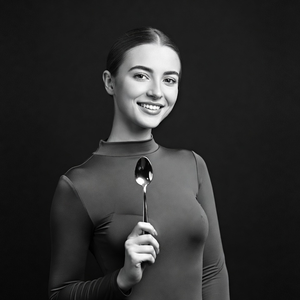 A young White woman with her hair in a bun smiles while holding a large spoon in her right hand. She wears a form-fitting black turtleneck top and stands against a solid black background. The image is in black and white.