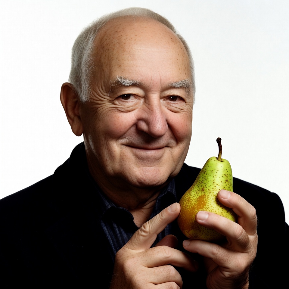 An elderly White man with white hair and glasses smiles while holding a green pear in his hand. He wears a dark suit jacket and light blue collared shirt. The image is set against a plain white background.