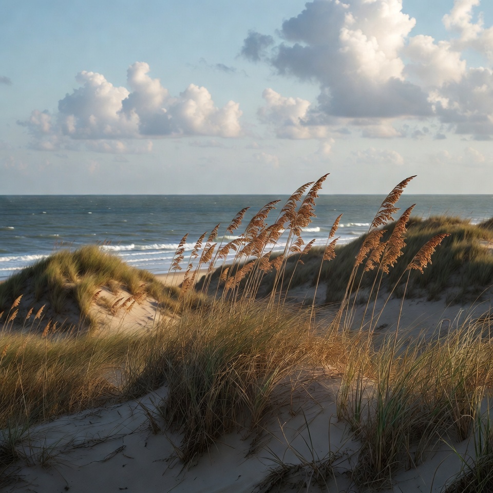 Golden sea oats sway in the foreground atop sandy dunes at the beach. Gentle waves lap the shoreline under a partly cloudy sky. The scene captures a serene coastal landscape with tall grasses and distant ocean horizon.