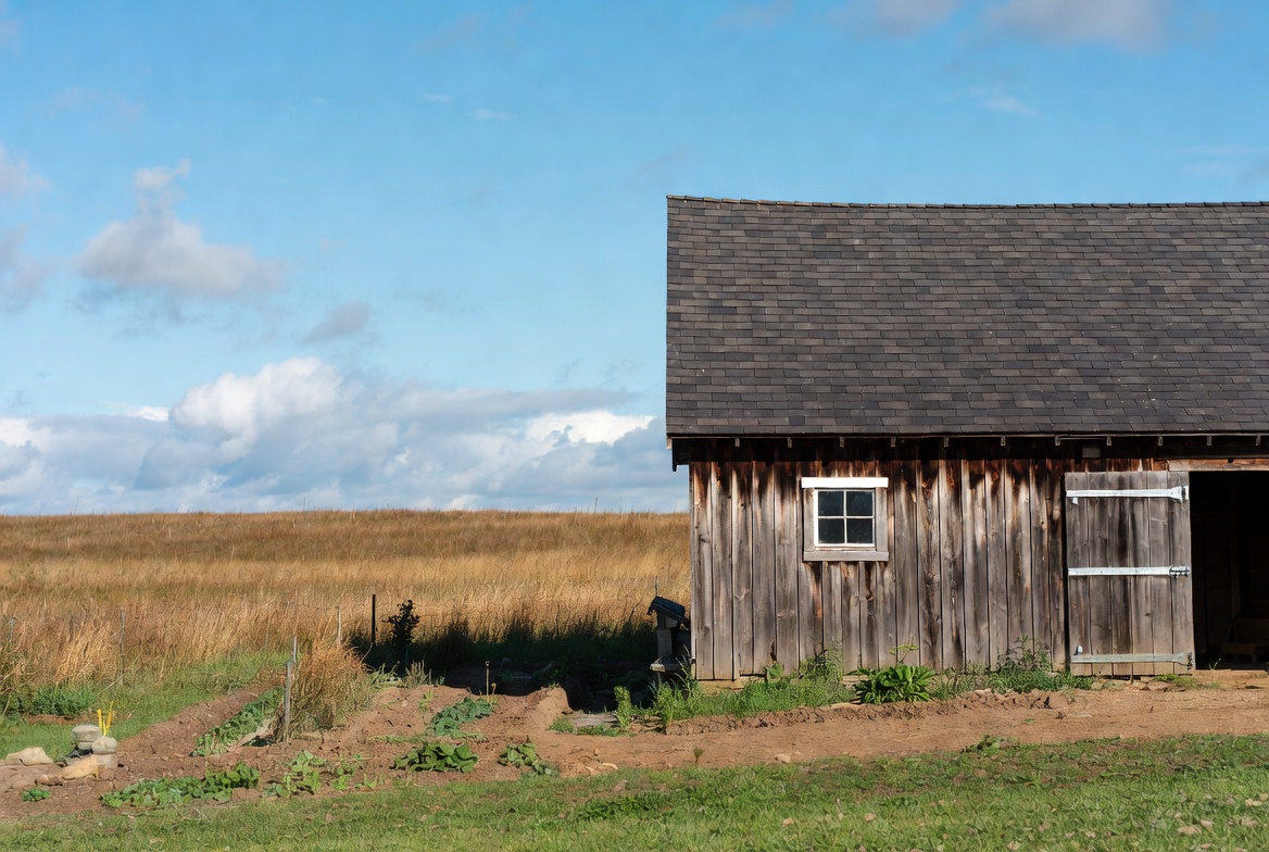 A weathered wooden barn with a dark shingled roof stands beside a vast field of golden grass under a partly cloudy blue sky. The barn features a small window and open double doors, with patches of dirt and grass in the foreground. Shadows from nearby plants and fence posts add depth to the rural scene.