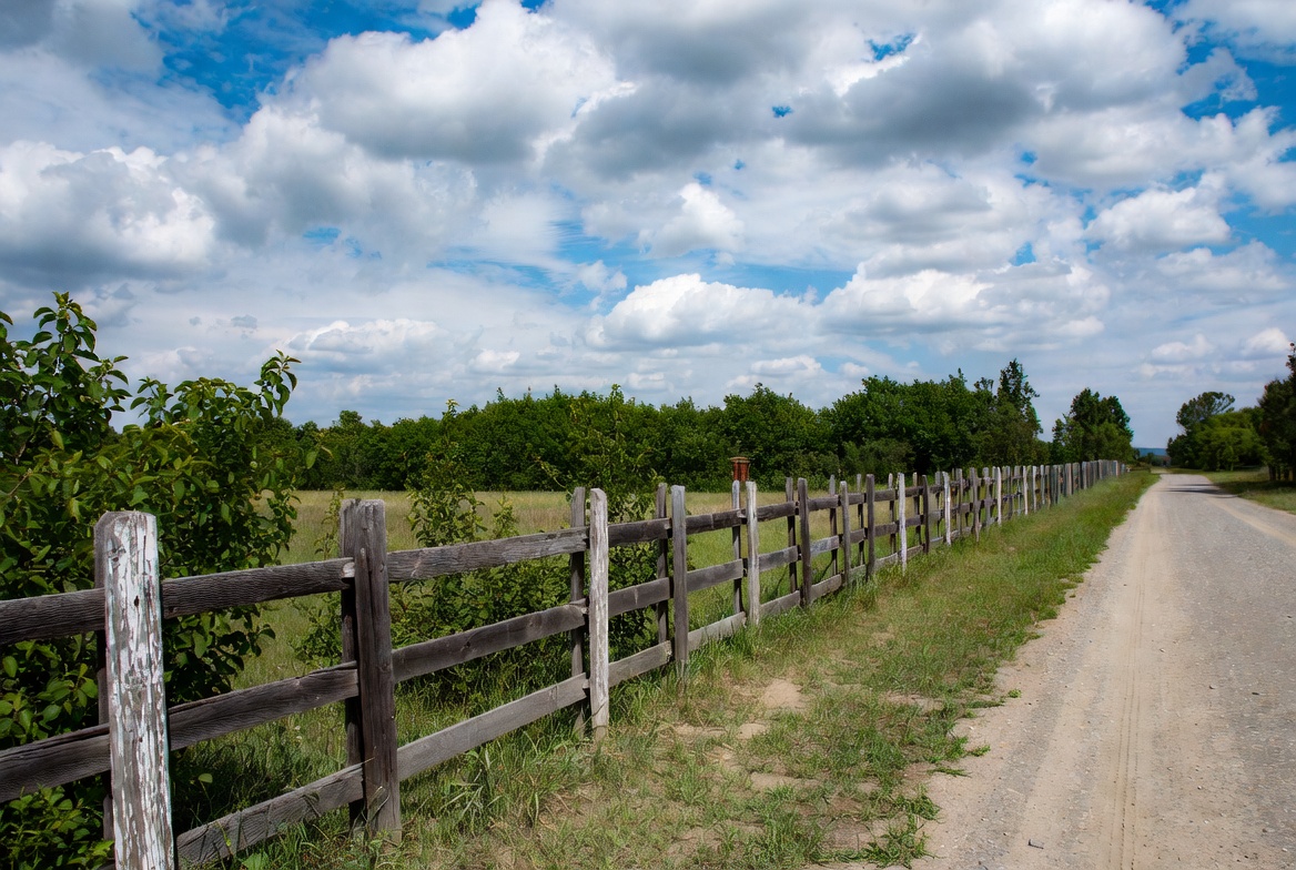 blue sky, bushes, clouds, country road, countryside, dirt road, fence, field, grass, grassy field, green bushes, meadow, nature, outdoors, pasture, path, road, rural landscape, scenery, sky, summer day, trail, weathered wood, white clouds, wooden fence