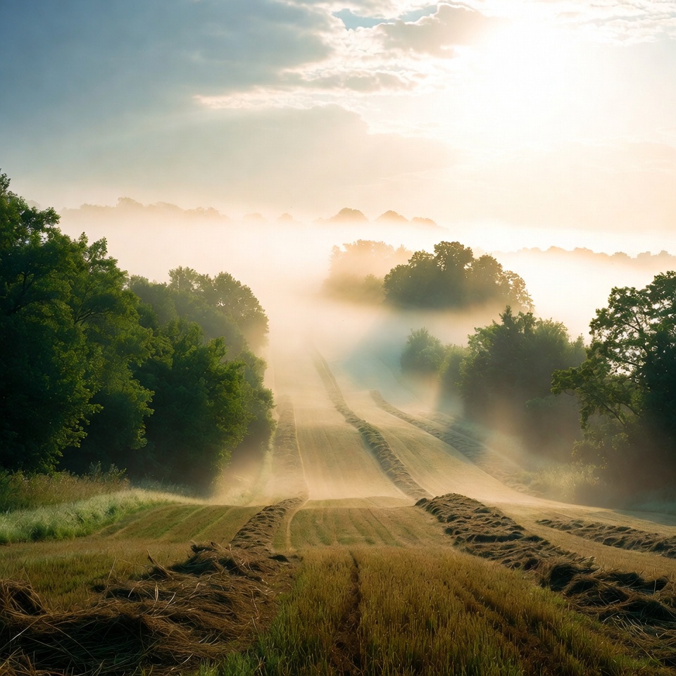 agriculture, blue sky, clouds, countryside, cut hay, dawn mist, dirt road, field path, foggy road, forest edge, golden light, green fields, hay fields, landscape, mist, morning fog, nature, pathway, rural scene, scenic road, sunrise, trees, rural road