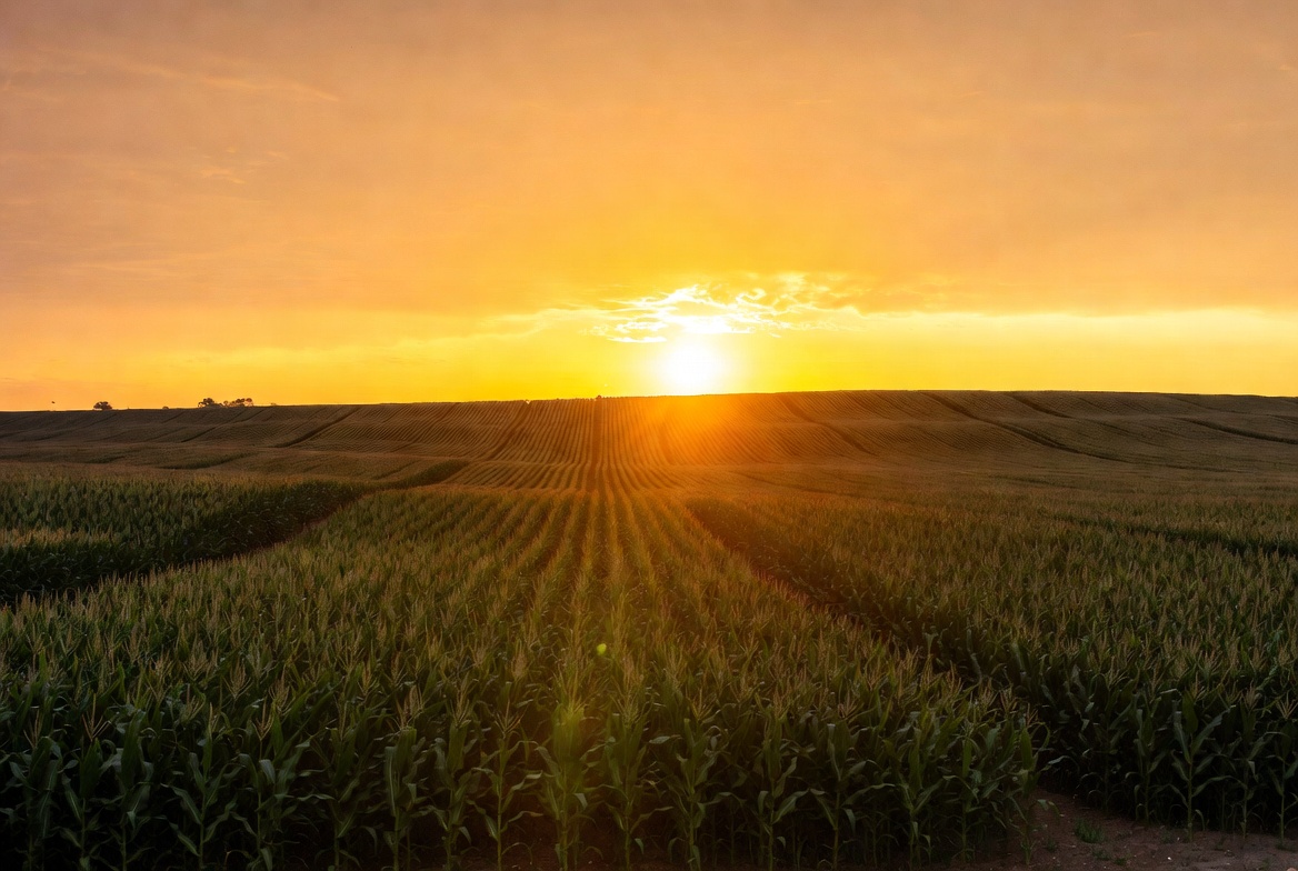 agriculture, corn fields, cornfield, crops, dusk, evening sky, farming, farmland, field, golden hour, green crops, harvest time, horizon, landscape, maize, nature, orange sky, outdoors, plowed rows, rural landscape, scenery, sun rays, sunset
