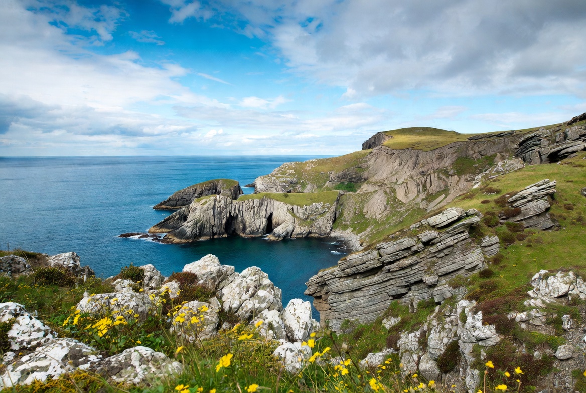 blue sky, clouds, coastal cliffs, coastline, cove, dramatic cliffs, grass, green hills, nature, ocean, ocean view, rock formations, rocks, rugged landscape, scenery, sea, seascape, wildflowers, yellow flowers, cliffs