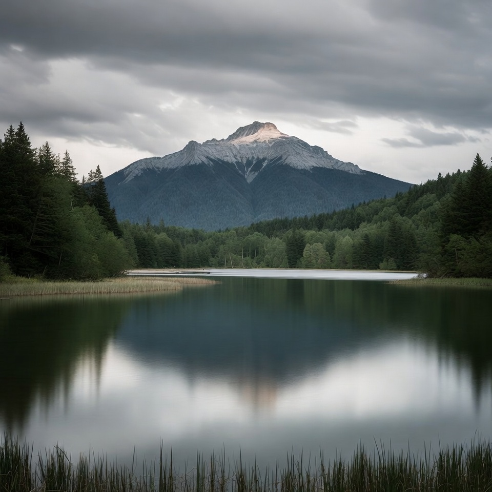 A majestic snow-capped mountain rises dramatically behind a serene lake, its peak glowing under cloudy skies. The calm water perfectly mirrors the mountain and surrounding dense evergreen forests. Reeds frame the foreground of this tranquil alpine landscape.