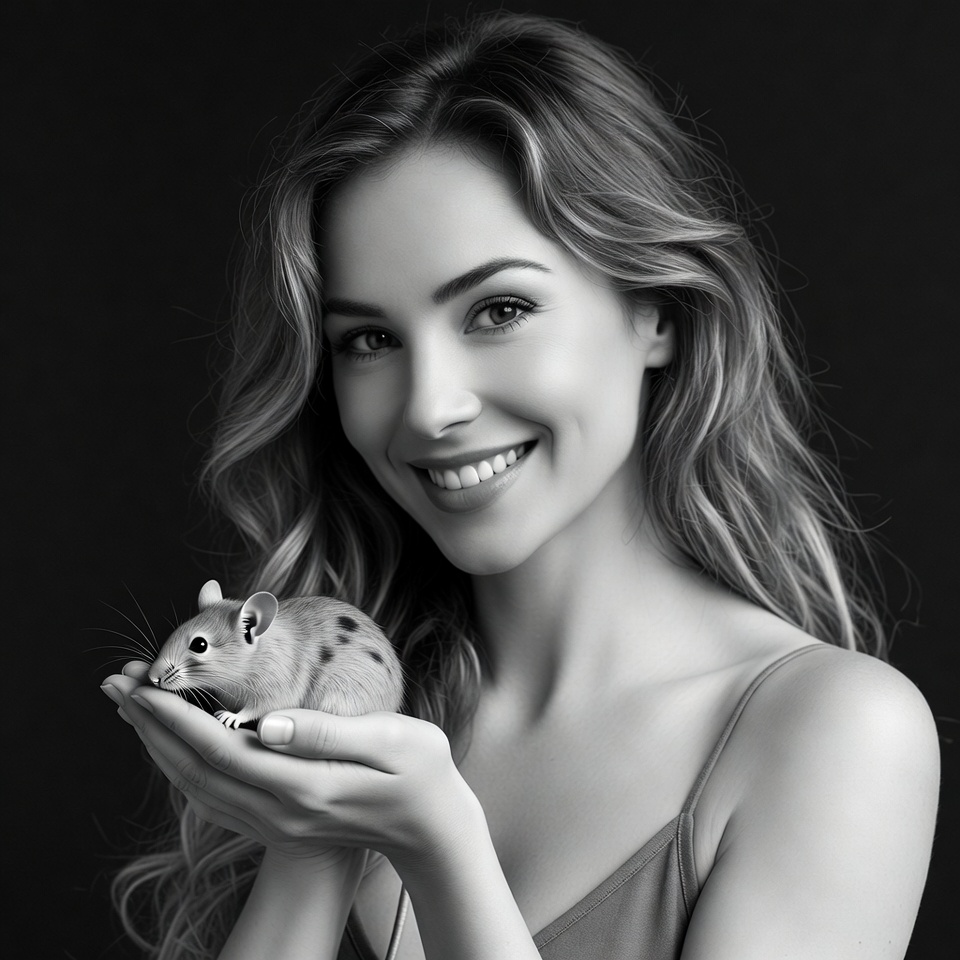 White, animal, black background, blonde hair, cute gerbil, female, gerbil, hands, holding gerbil, open palms, pet, portrait, small rodent, smiling, spotted gerbil, wavy hair, young woman, woman