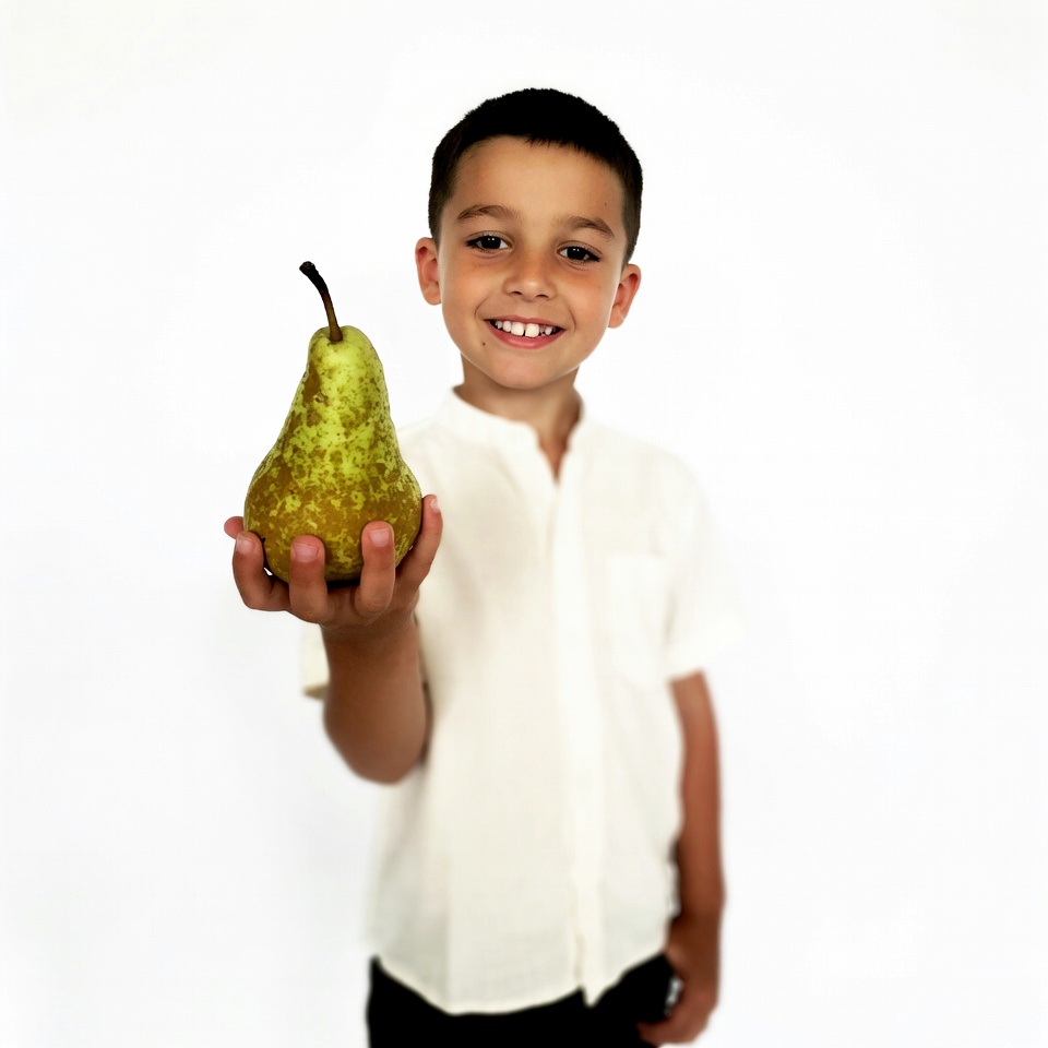 Multiracial, child, dark hair, fruit, green pear, holding pear, isolated, kid, male, ripe pear, short hair, smiling boy, white background, white shirt, young boy, boy