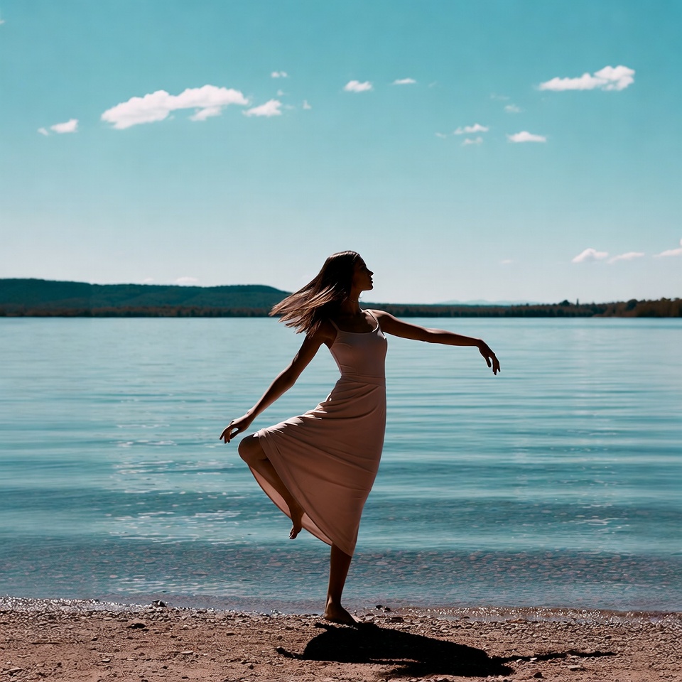A woman in a beige spaghetti-strap dress dances gracefully on a sandy beach by a calm lake. She stands in profile with long hair blowing in the wind, one leg lifted elegantly, and arms extended. Distant mountains and a clear blue sky with clouds form the backdrop.