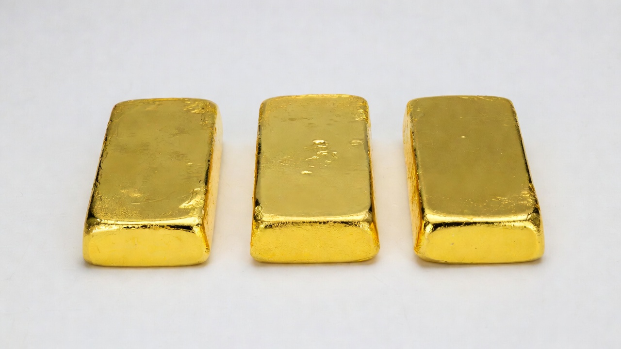 Three shiny rectangular gold bars are arranged in a row on a plain white surface. Each bar has a smooth, reflective gold surface with slight variations in shine. They are positioned closely together against the isolated background.