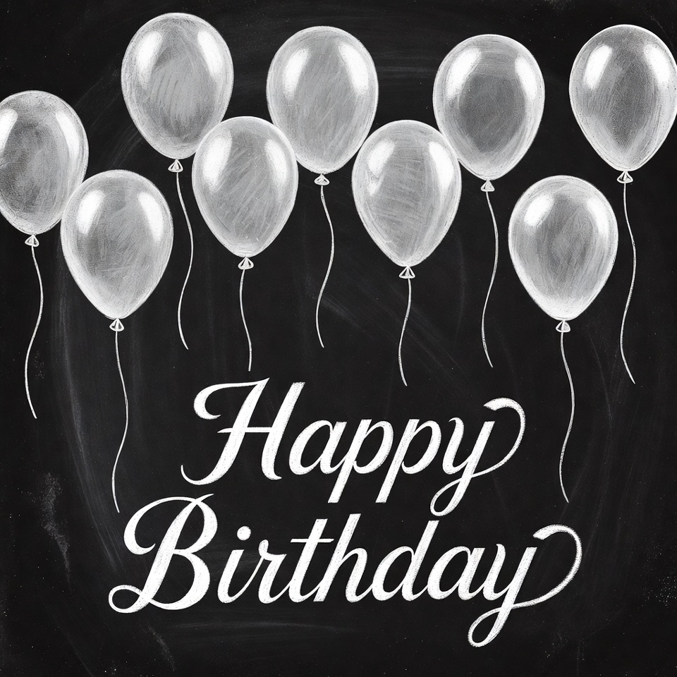 balloons, birthday card, birthday illustration, birthday text, blackboard, chalk art, chalk drawing, chalkboard, festive balloons, floating balloons, illustration, party balloons, watercolor, white balloons, happy birthday