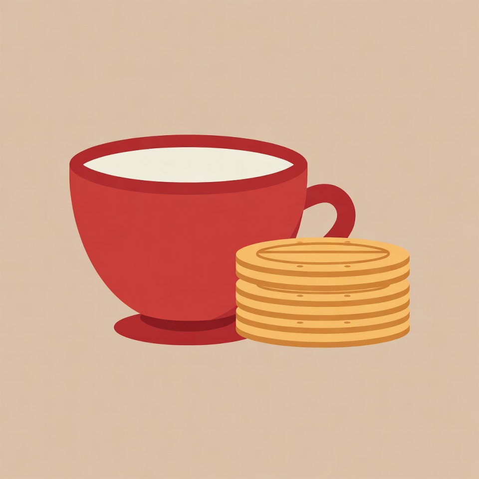 A simple illustration shows a red mug filled with white milk next to a stack of golden cookies. The mug has a handle and sits on a beige background. Both items are depicted in a flat, cartoonish style.