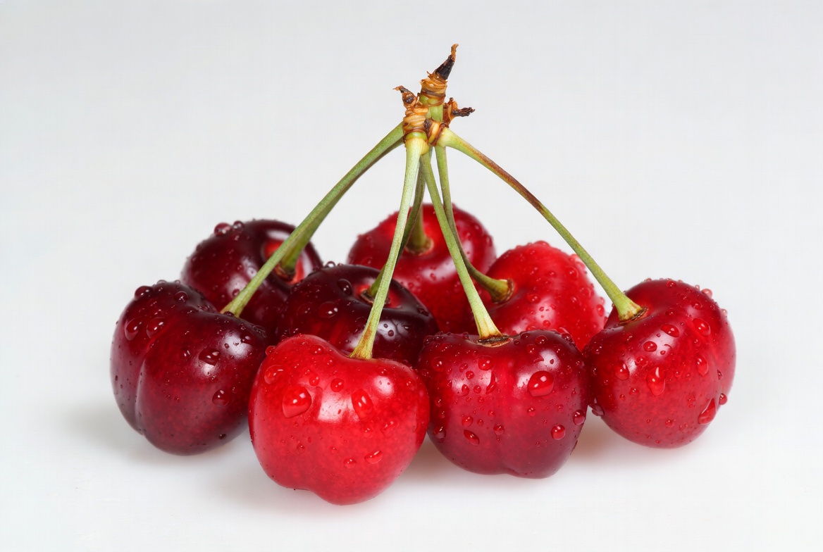 cherry bunch, cherry cluster, cherry stems, dew drops, fresh cherries, fresh produce, fruit, isolated background, juicy cherries, red cherries, red fruit, ripe fruit, sweet cherries, water droplets, cherries