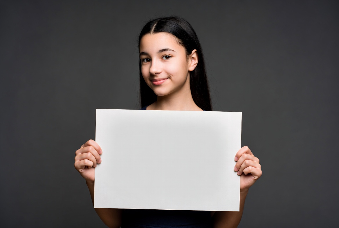 A young Latina girl with long dark hair smiles while holding a large blank white sign in front of her. She stands against a plain gray background, gripping the sign with both hands. Her expression is friendly and engaging.