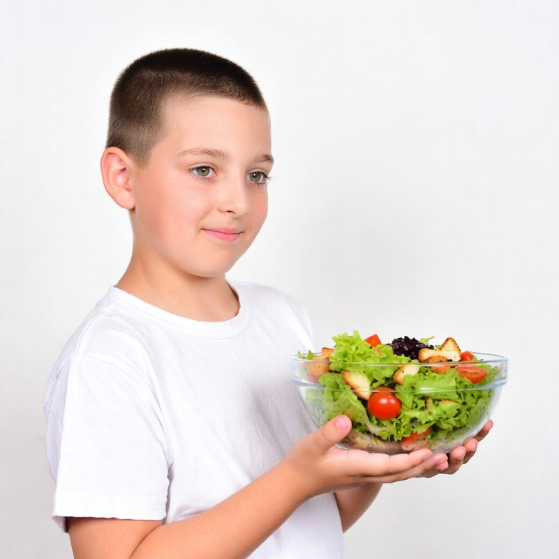 Boy holding fresh salad bowl