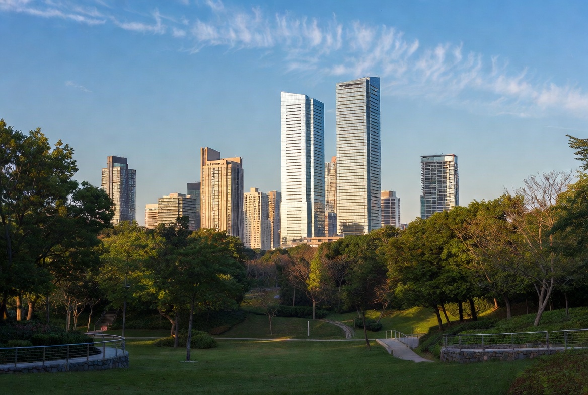 Tall modern skyscrapers rise above a lush green park with walking paths and trees. The scene features a clear blue sky with wispy clouds during golden hour lighting. Various high-rise buildings with glass facades dominate the skyline.