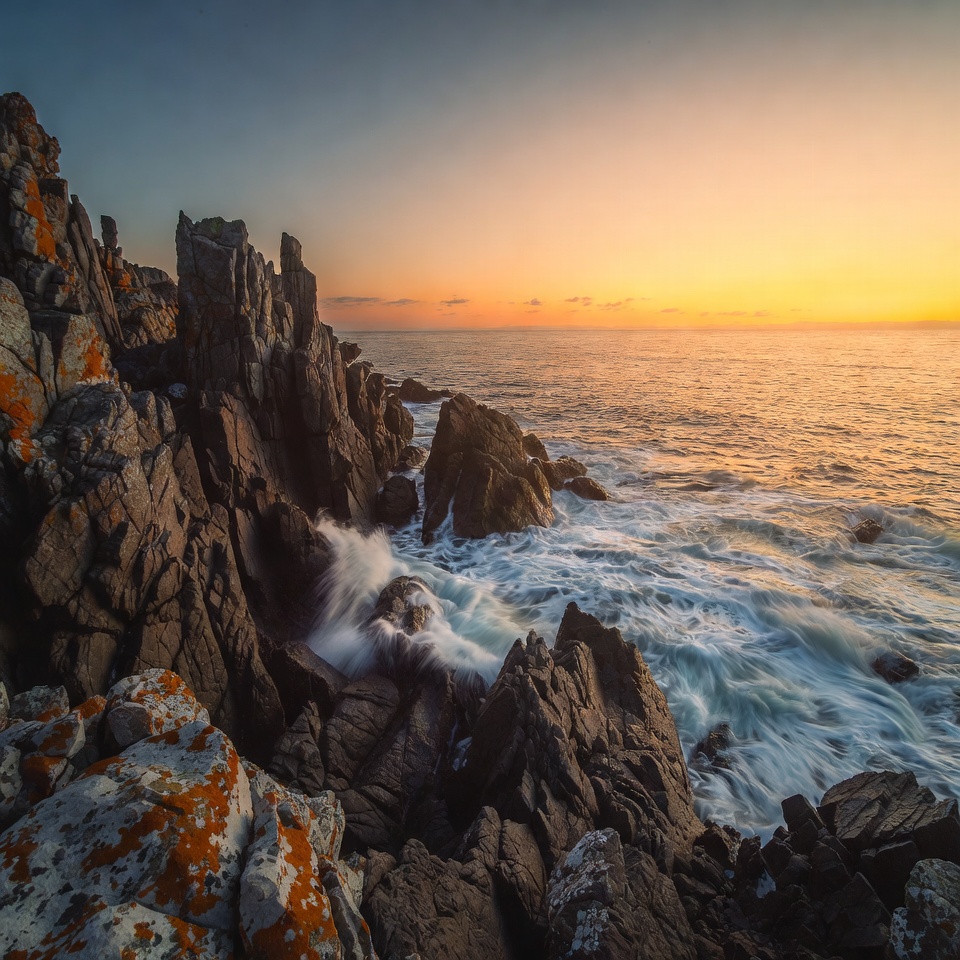 blue sky, coastal rocks, coastline, crashing waves, dramatic sunset, horizon, landscape, lichen rocks, nature, ocean, ocean view, orange sunset, rocks, rocky shore, rugged cliffs, sea, seascape, water splash, waves, sunset