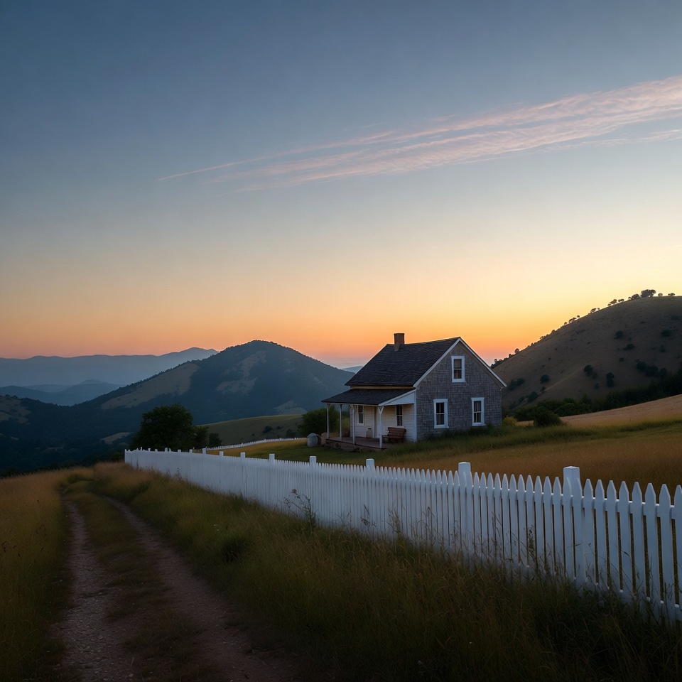 A small gray shingled house with white trim sits on a grassy hill surrounded by rolling mountains during sunset. A white picket fence lines a dirt path leading to the house, with golden hour light casting warm orange and pink hues across the sky and landscape. Distant hills and fields complete the serene rural scene.
