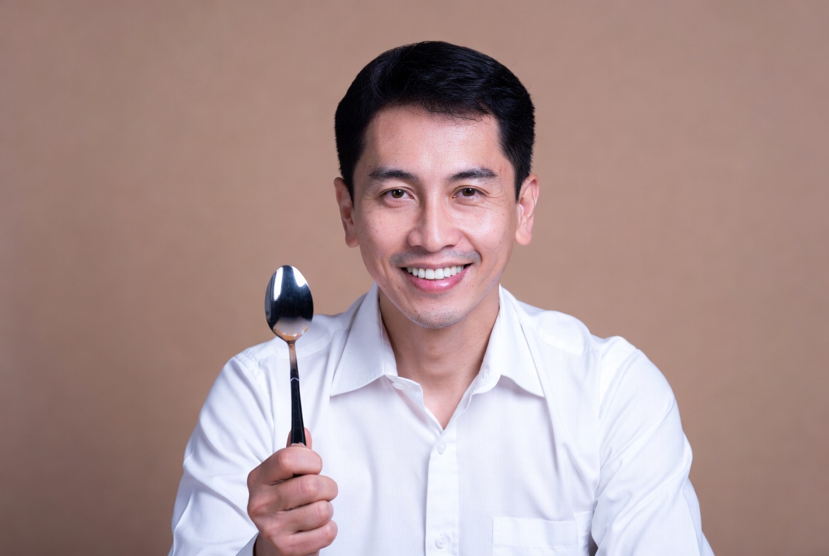 A smiling Asian man with short black hair holds a shiny metal spoon in his right hand. He wears a white dress shirt with the top button open and stands against a plain beige background. His expression is friendly and direct to the camera.