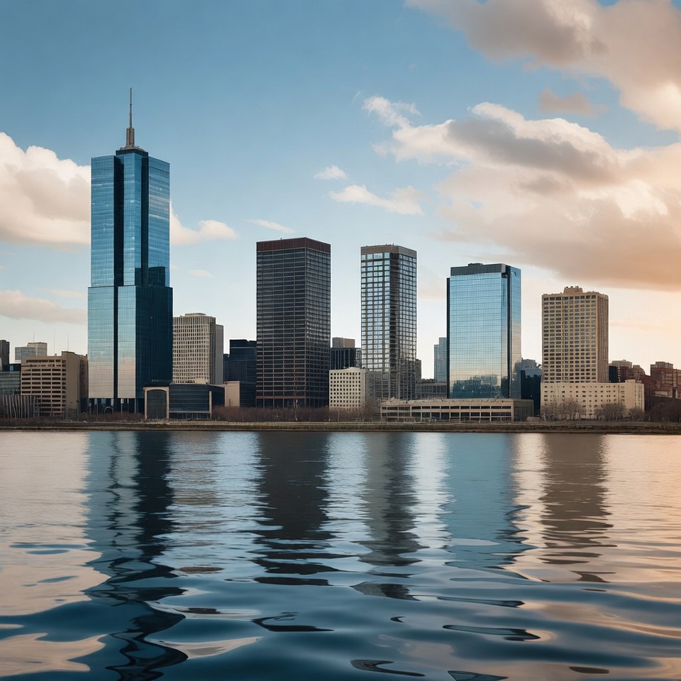 A modern city skyline with tall glass skyscrapers stands along a calm river. The buildings reflect clearly in the water under a partly cloudy sky during sunset. Prominent twin towers dominate the scene with surrounding mid-rise structures.