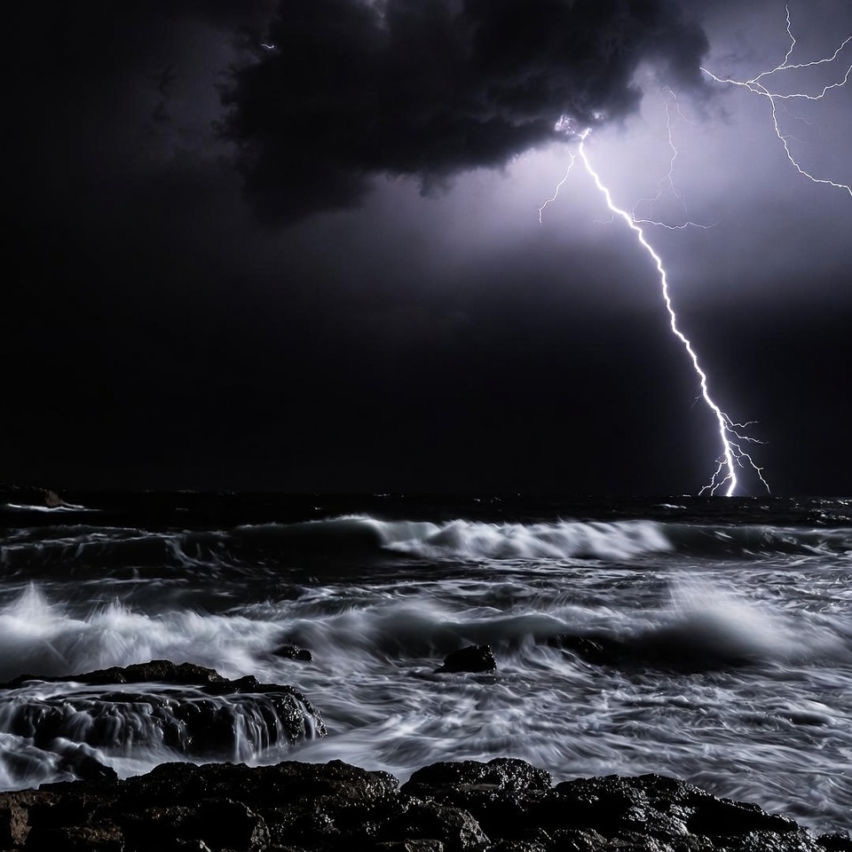 bolt, clouds, crashing waves, dark clouds, dramatic sky, electric bolt, nature, night sky, ocean, powerful storm, rocks, rocky shore, sea, storm, strike, thunder, thunderclouds, waves, weather, lightning