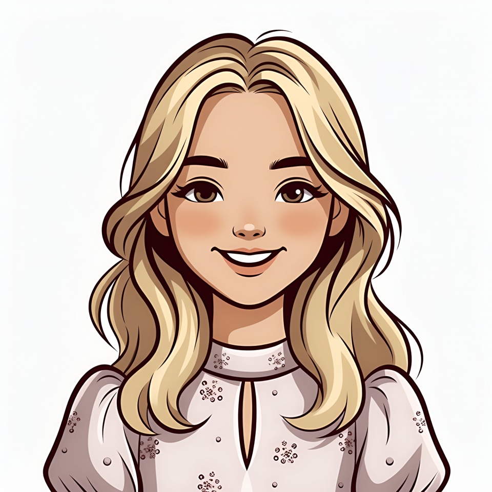 A cute cartoon illustration of a young girl with long wavy blonde hair and fair skin smiles happily at the viewer. She has large expressive eyes, rosy cheeks, and wears a white collared blouse with puffed sleeves and small decorative dots. The character is depicted on a plain white background.